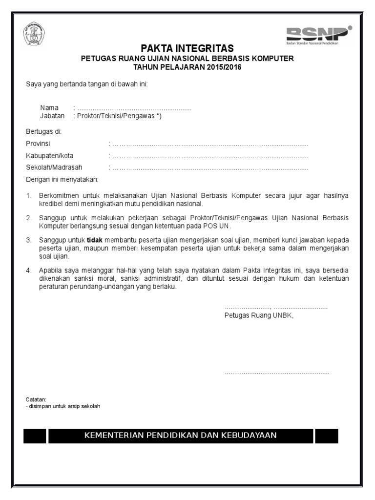 Pakta integritas adalah pernyataan komitmen atau janji bersama yang dibuat bersama sebagai bentuk kesanggupan untuk patuh terhadap ketentuan yang berlaku. Salah satu dan/atau semua pengurus badan usaha yang saya wakili tidak masuk dalam daftar hitam Substansi dari pakta integritas dituangkan ke dalam dokumen pakta integritas. Pakta integritas perangkat desa adalah pakta integritas yang ditandatangani oleh perangkat desa dan disaksikan oleh kepala desa tentang komitmen untuk melaksanakan tugas, fungsi, dan. Adalah mencetak pakta integritas sekolah pada menu raport mutu > pakta integritas.